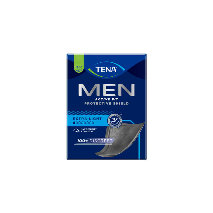 Ingen oro längre med TENA Men Active Fit Protective Shield – en droppskyddsplatta som skyddar mot lätt urinläckage, lukt och fukt. Dessa endast 3 mm tunna, stilrena svarta, bekväma och diskreta inkontinensskydd fångar upp oönskade droppar och håller dig fräsch och självsäker. Den triangelformade designen passar särskilt för mäns kroppar, och den absorberande kärnan håller vätskan inne. Droppskydden är förpackade i praktiska engångsförpackningar och sitter säkert på plats med tejpfäste. Oavsett om du är på resa, jobbet eller gymmet sitter skyddet i kalsongerna så säkert och diskret att du glömmer att du har det.